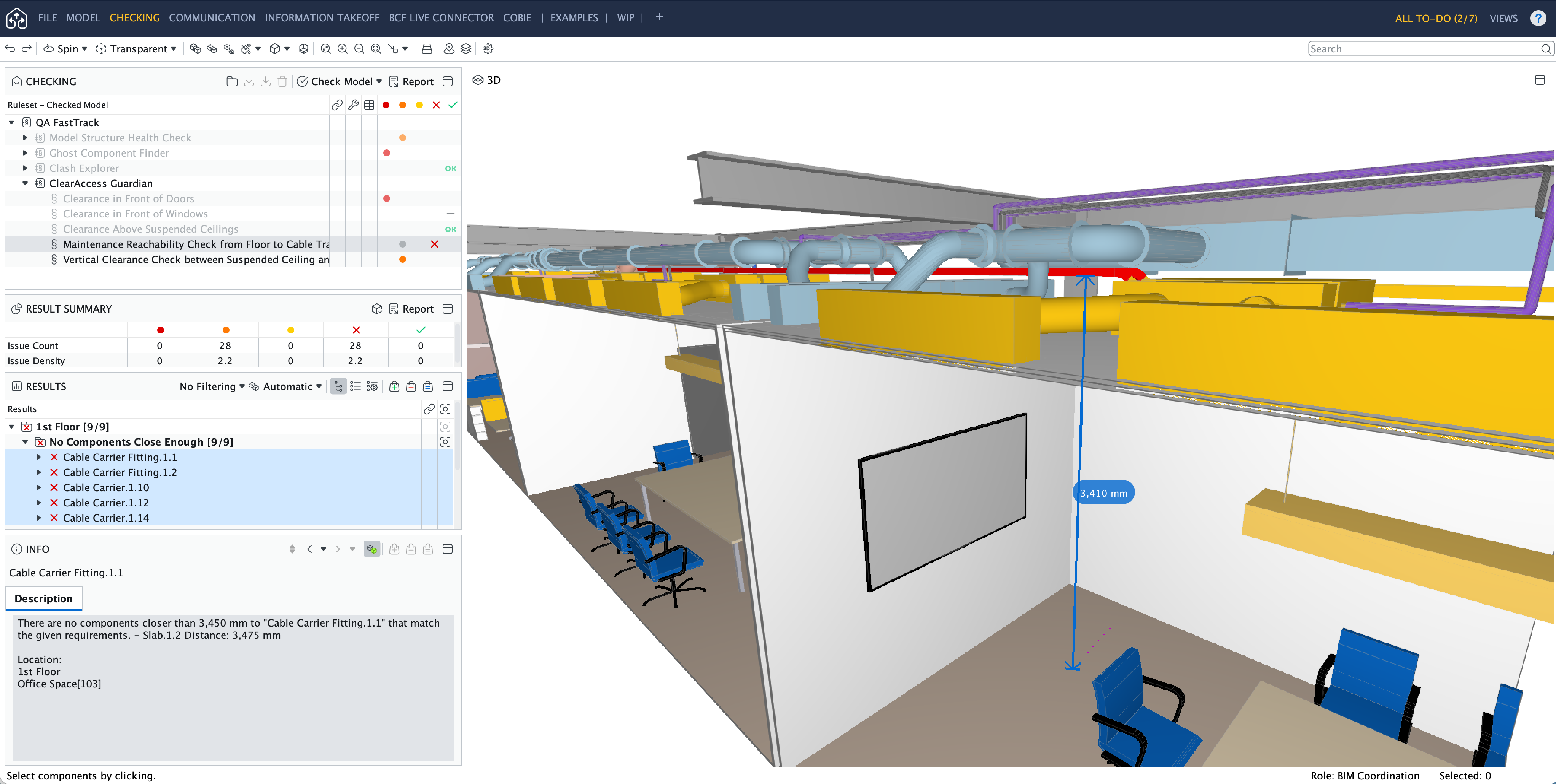 Uma regra de distância entre componentes, por exemplo, pode verificar o posicionamento das bandejas de cabos. As bandejas estão suficientemente altas acima do teto para que a plataforma elevatória possa passar por baixo delas? Estão suficientemente baixas para que a plataforma elevatória possa alcançá-las para manutenção?